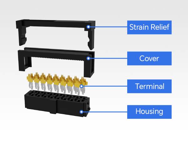 2. IDC W/T  應力消除裝置,其中應力消除蓋可消除應力,防止電纜因振動或外部拉動而松動,并增強公頭和母端配接期間的機械穩定性。